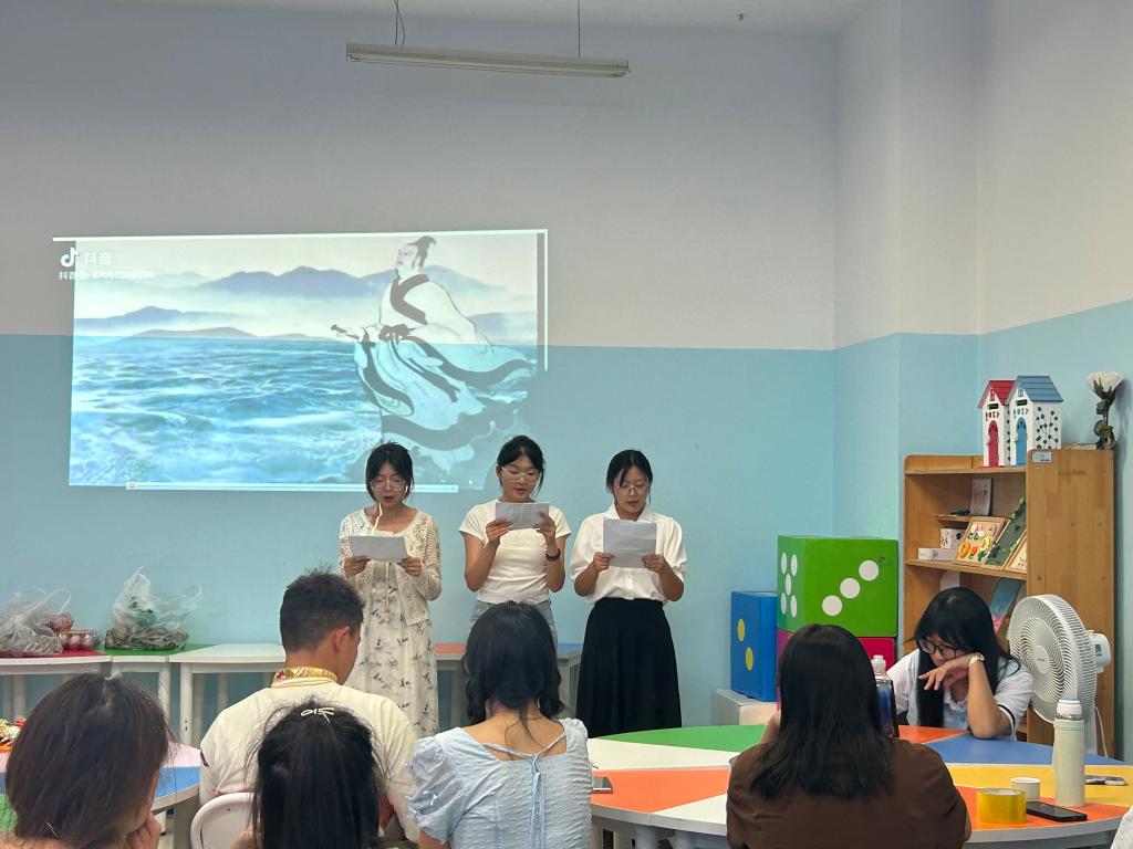 活动伊始,李玉琴介绍了端午节的历史背景和文化内涵。通过她的讲解,在场同学对端午节的由来、习俗及历史意义都有了更深入的了解。随后,藏族同学格桑达娃献上了精彩舞蹈《吉祥祝福》,将祝福传递给了在场的每一位观众。最后,来自2023级的同学沈寿贵、田雯清、孟鑫儒朗诵了爱国诗人屈原的经典作品《离骚》,赢得了同学们的阵阵掌声。