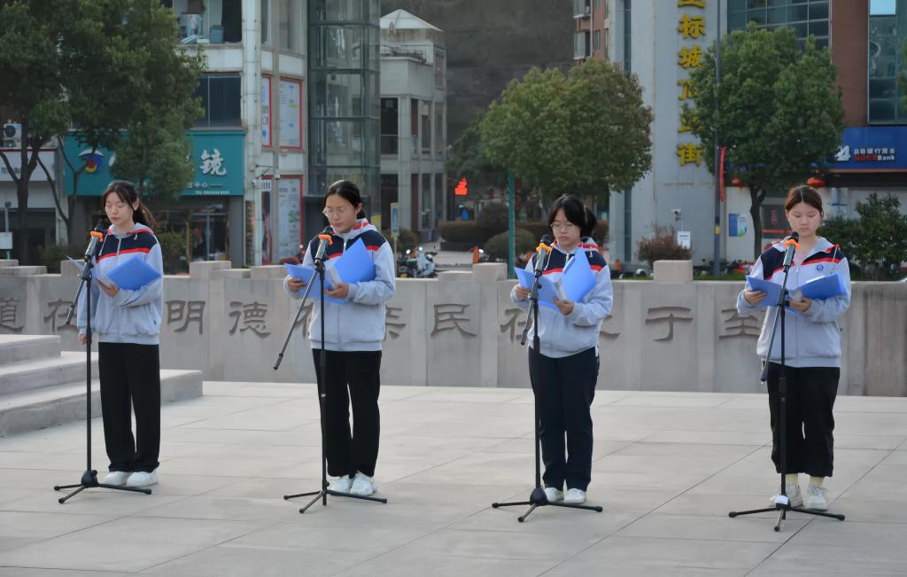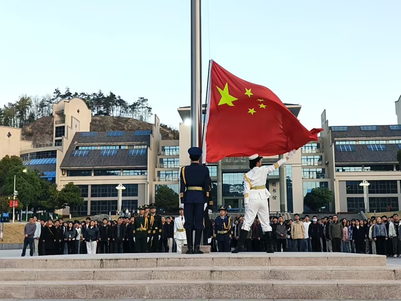 早上6:50,升旗仪式正式开始。伴随着庄严的国歌,五星红旗迎着晨光徐徐升起,全体师生肃立,向国旗行注目礼,齐声高唱国歌,现场气氛庄重肃穆。